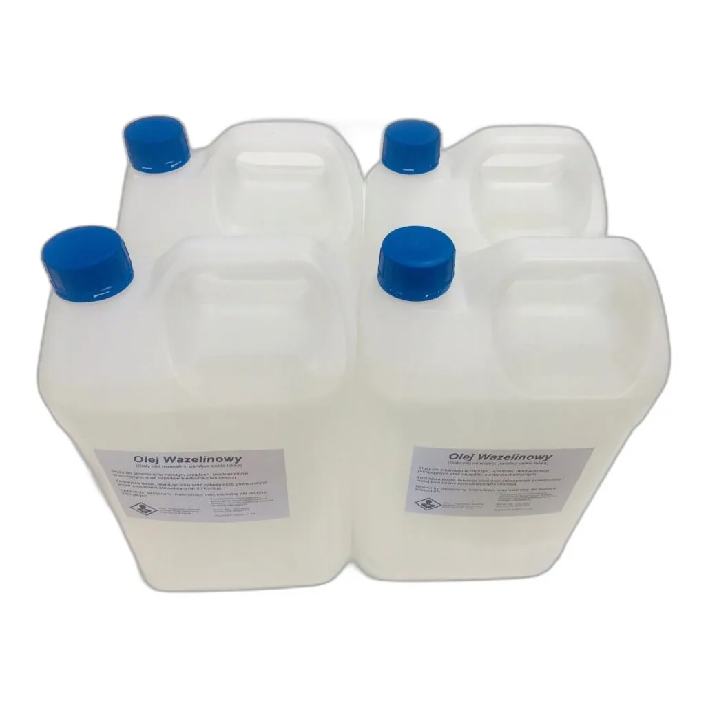 Olej wazelinowy w formie 4x5L to zestaw ułatwiający magazynowanie. Wzór: C18H38. CAS: 8012-95-1. Czystość 100%. Postać: lekko gęstsza ciecz, bezbarwna. Masa molowa: ok. 254 g/mol. Butelki z HDPE, z dozownikem.